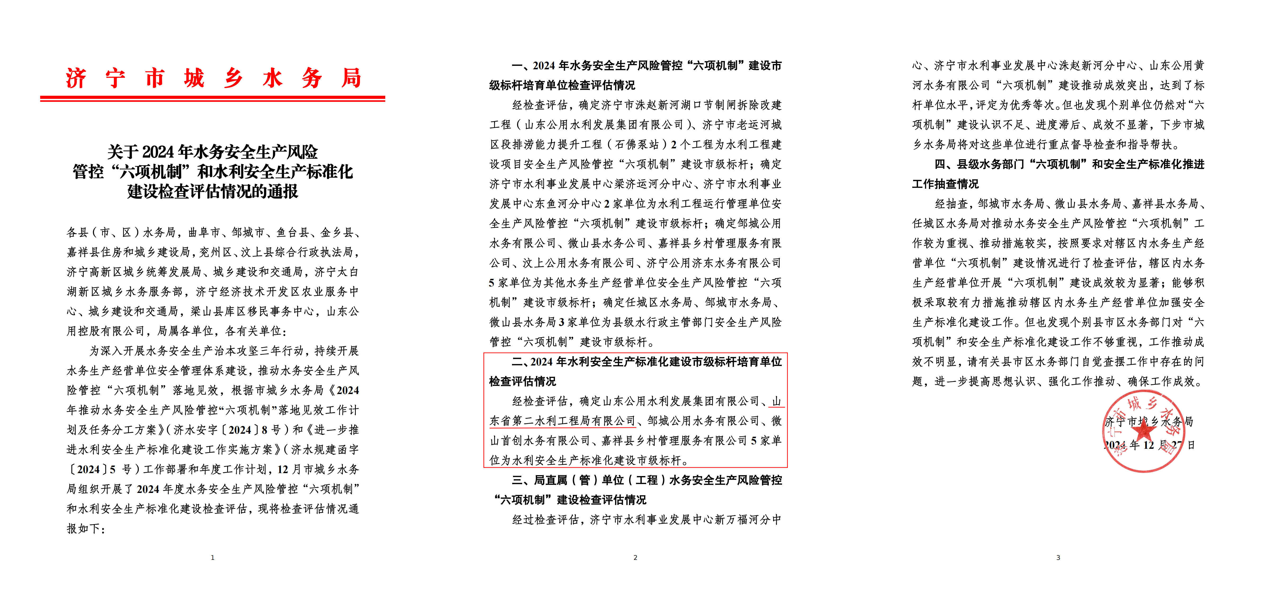 近日,济宁市城乡水务局公布了2024 年水务安全生产风险管控“六项机制”和水利安全生产标准化建设检查评估情况,经检查评估,二局有限公司被评为水利安全生产标准化建设市级标杆企业。
