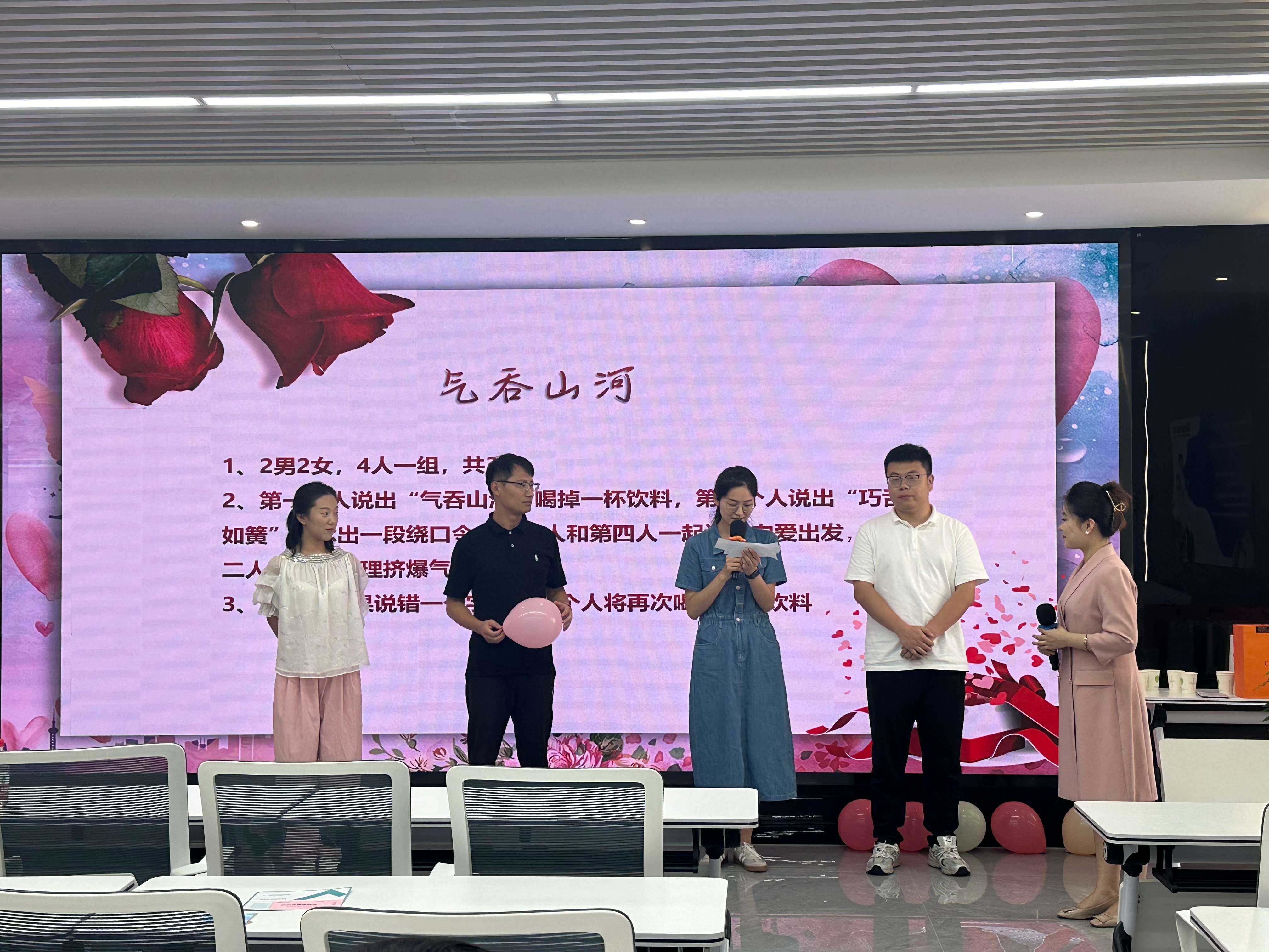 活动现场,青年们欢聚一堂,在主持人的开场白中拉开序幕。伴随着优美的旋律,他们放下职场中的严谨,沉浸在轻松愉快的氛围里。通过击鼓传花、气吞山河、你画我猜等趣味互动游戏,大家的心情从拘谨中慢慢释放轻松和快乐,尽情参与到活动中。活动现场欢声笑语,最终多人牵手成功。